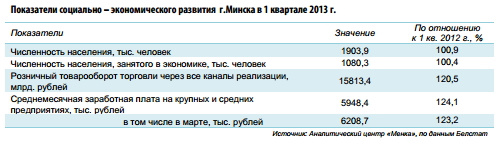 Минск – крупнейший экономический центр страны, занимающий первое место по основным социально-экономическим показателям среди всех регионов Республики Беларусь. Население Минска характеризуется высокой экономической активностью, в 1 квартале 2013 г. уровень среднемесячной заработной платы в городе на 31,3% выше, а уровень безработицы на 0,4 процентных пункта ниже среднереспубликанского. |