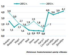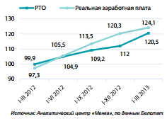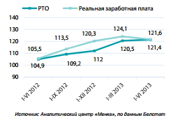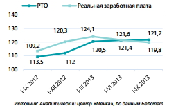 В июле зарплата, которая является одним из основ-ных драйверов роста потребительского рынка, достигла рекордного уровня в 2013 году — 785 долларов США в эквиваленте. В результате, несмотря на незначительное уменьшение средней зарплаты в августе-сентябре, по-прежнему сохраняются высокие темпы роста розничного товарооборота — 121,7%. |