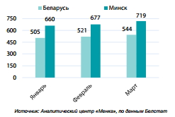 Динамика средней заработной платы в Республике Беларусь и г.Минске в 1 квартале 2013г., долл. США