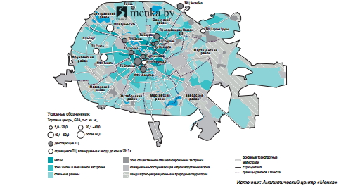 Территориальная структура расположения торговых центров г.Минска в некоторой степени отражает как этапы освоения территории города в рамках строительства крупных торговых объектов, так и структуру наиболее активных покупательских потоков. Лидирующую позицию по количеству действующих торговых центров и по обеспечению качественными торговыми площадями занимает Центральный район г.Минска. В районе 13 крупных действующих торговых центров, из них 3 концептуальные («Немигофф», «Замок», «ALL»). На конец 1 квартала обеспеченность качественными торговыми площадями населения Центрального района составила 385 кв. м на 1000 человек.