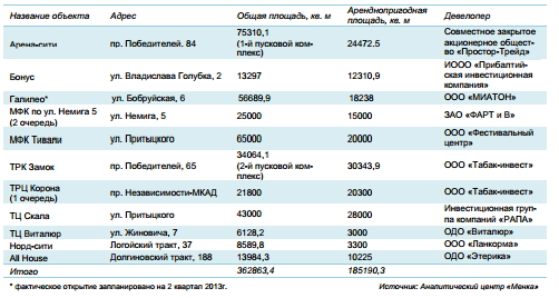 В течение года рынок торговой недвижимости г.Минска продолжит свой поступательный рост. Всего заявлено к вводу 11 торговых центров общей площадью от 6000 до 65000 кв. м. Однозначно это станет усилением конкуренции, в которой очень нуждается столичный рынок торговой недвижимости.