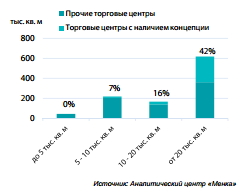 В структуре рынка действующих торговых центров в г.Минске на начало и конец 1 квартала 2013 г. доля концептуальных составила 29% (от общей площади), по итогам года данный показатель с учетом заявленных к вводу в эксплуатацию объектов оценочно может составить 45%.